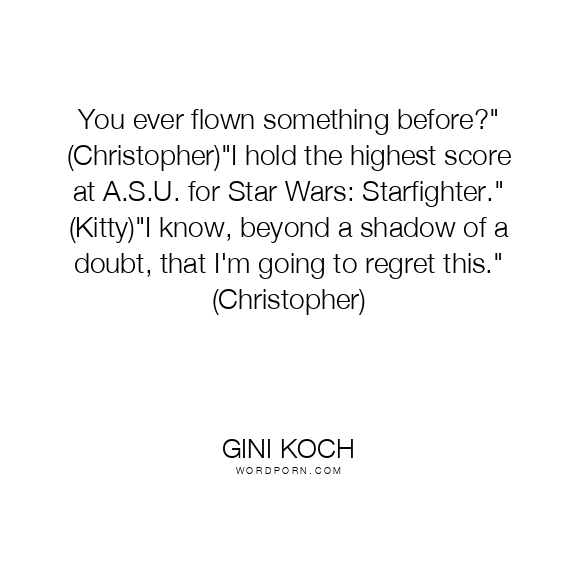 You ever flown something before?" (Christopher)"I hold the highest score at A.S.U. for Star Wars: Starfighter." (Kitty)"I know, beyond a shadow of a doubt, that I'm going to regret this." (Christopher)