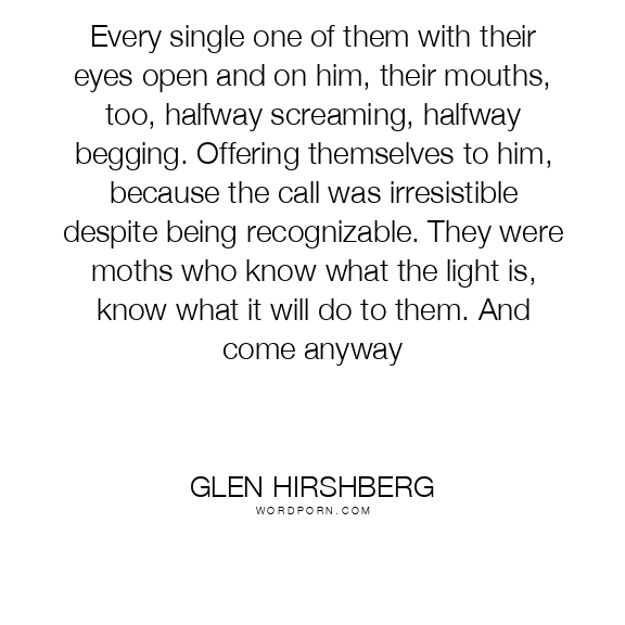 Every single one of them with their eyes open and on him, their mouths, too, halfway screaming, halfway begging. Offering themselves to him, because the call was irresistible despite being recognizable. They were moths who know what the light is, know what it will do to them. And come anyway