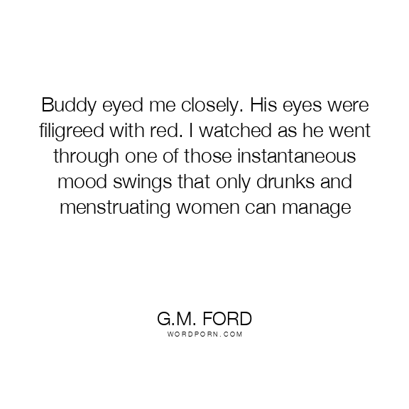Buddy eyed me closely. His eyes were filigreed with red. I watched as he went through one of those instantaneous mood swings that only drunks and menstruating women can manage