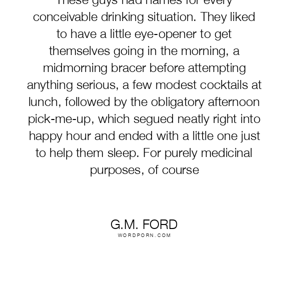 These guys had names for every conceivable drinking situation. They liked to have a little eye-opener to get themselves going in the morning, a midmorning bracer before attempting anything serious, a few modest cocktails at lunch, followed by the obligatory afternoon pick-me-up, which segued neatly right into happy hour and ended with a little one just to help them sleep. For purely medicinal purposes, of course