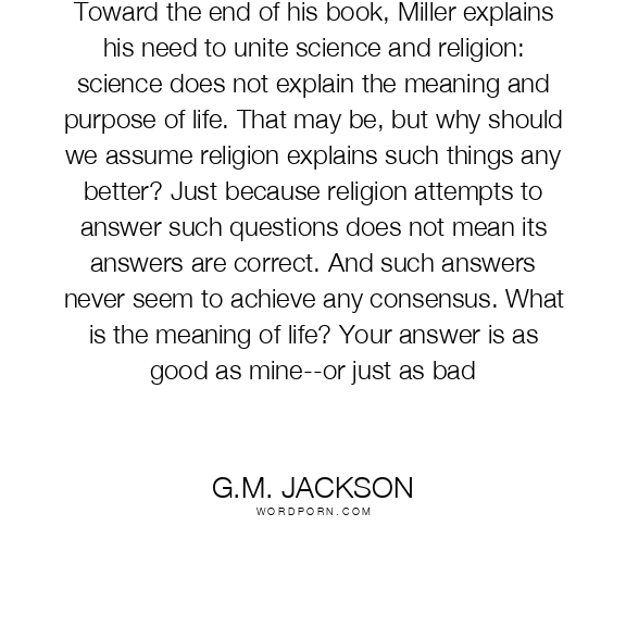 Toward the end of his book, Miller explains his need to unite science and religion: science does not explain the meaning and purpose of life. That may be, but why should we assume religion explains such things any better? Just because religion attempts to answer such questions does not mean its answers are correct. And such answers never seem to achieve any consensus. What is the meaning of life? Your answer is as good as mine--or just as bad