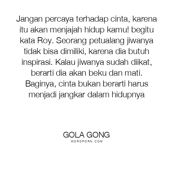 Jangan percaya terhadap cinta, karena itu akan menjajah hidup kamu! begitu kata Roy. Seorang petualang jiwanya tidak bisa dimiliki, karena dia butuh inspirasi. Kalau jiwanya sudah diikat, berarti dia akan beku dan mati. Baginya, cinta bukan berarti harus menjadi jangkar dalam hidupnya