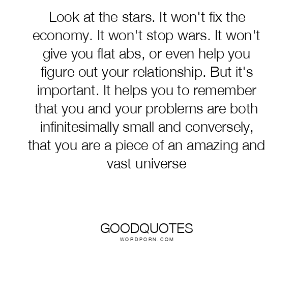 Look at the stars. It won't fix the economy. It won't stop wars. It won't give you flat abs, or even help you figure out your relationship. But it's important. It helps you to remember that you and your problems are both infinitesimally small and conversely, that you are a piece of an amazing and vast universe
