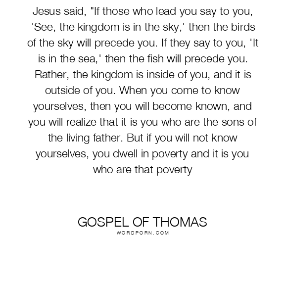 Jesus said, "If those who lead you say to you, 'See, the kingdom is in the sky,' then the birds of the sky will precede you. If they say to you, 'It is in the sea,' then the fish will precede you. Rather, the kingdom is inside of you, and it is outside of you. When you come to know yourselves, then you will become known, and you will realize that it is you who are the sons of the living father. But if you will not know yourselves, you dwell in poverty and it is you who are that poverty
