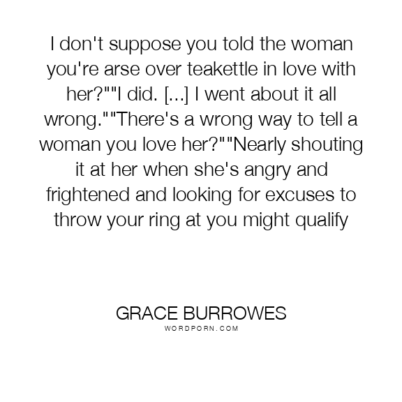 I don't suppose you told the woman you're arse over teakettle in love with her?""I did. [...] I went about it all wrong.""There's a wrong way to tell a woman you love her?""Nearly shouting it at her when she's angry and frightened and looking for excuses to throw your ring at you might qualify