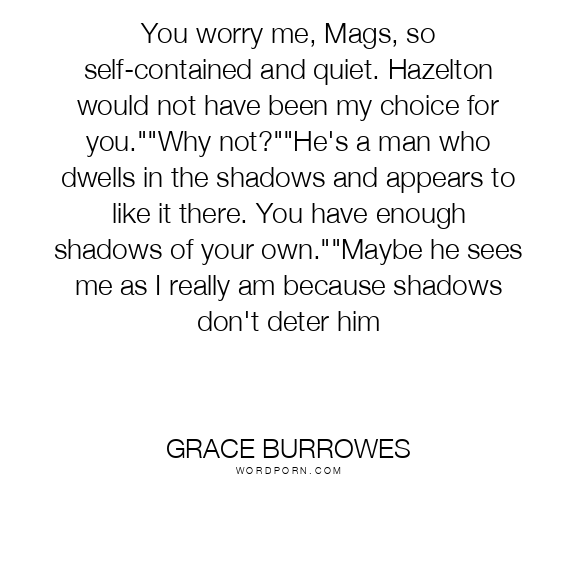 You worry me, Mags, so self-contained and quiet. Hazelton would not have been my choice for you.""Why not?""He's a man who dwells in the shadows and appears to like it there. You have enough shadows of your own.""Maybe he sees me as I really am because shadows don't deter him