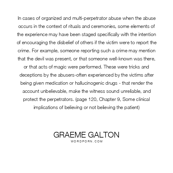 In cases of organized and multi-perpetrator abuse when the abuse occurs in the context of rituals and ceremonies, some elements of the experience may have been staged specifically with the intention of encouraging the disbelief of others if the victim were to report the crime. For example, someone reporting such a crime may mention that the devil was present, or that someone well-known was there, or that acts of magic were performed. These were tricks and deceptions by the abusers-often experienced by the victims after being given medication or hallucinogenic drugs - that render the account unbelievable, make the witness sound unreliable, and protect the perpetrators. (page 120, Chapter 9, Some clinical implications of believing or not believing the patient)