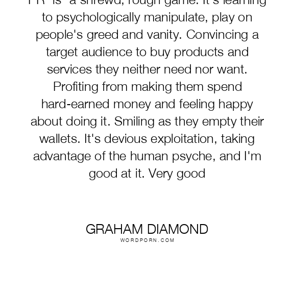 PR *is* a shrewd, rough game. It's learning to psychologically manipulate, play on people's greed and vanity. Convincing a target audience to buy products and services they neither need nor want. Profiting from making them spend hard-earned money and feeling happy about doing it. Smiling as they empty their wallets. It's devious exploitation, taking advantage of the human psyche, and I'm good at it. Very good