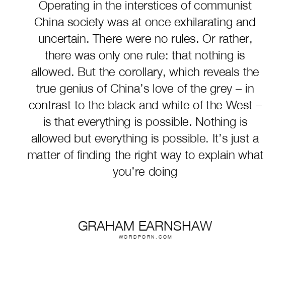Operating in the interstices of communist China society was at once exhilarating and uncertain. There were no rules. Or rather, there was only one rule: that nothing is allowed. But the corollary, which reveals the true genius of China’s love of the grey – in contrast to the black and white of the West – is that everything is possible. Nothing is allowed but everything is possible. It’s just a matter of finding the right way to explain what you’re doing