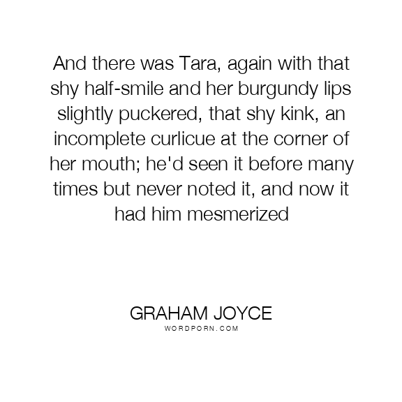 And there was Tara, again with that shy half-smile and her burgundy lips slightly puckered, that shy kink, an incomplete curlicue at the corner of her mouth; he'd seen it before many times but never noted it, and now it had him mesmerized