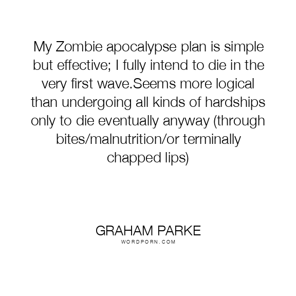 My Zombie apocalypse plan is simple but effective; I fully intend to die in the very first wave.Seems more logical than undergoing all kinds of hardships only to die eventually anyway (through bites/malnutrition/or terminally chapped lips)
