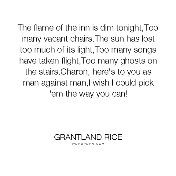 The flame of the inn is dim tonight,Too many vacant chairs.The sun has lost too much of its light,Too many songs have taken flight,Too many ghosts on the stairs.Charon, here's to you as man against man,I wish I could pick 'em the way you can!