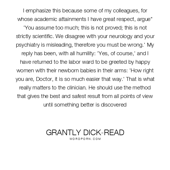 I emphasize this because some of my colleagues, for whose academic attainments I have great respect, argue" 'You assume too much; this is not proved; this is not strictly scientific. We disagree with your neurology and your psychiatry is misleading, therefore you must be wrong.' My reply has been, with all humility: 'Yes, of course,' and I have returned to the labor ward to be greeted by happy women with their newborn babies in their arms: 'How right you are, Doctor, it is so much easier that way.' That is what really matters to the clinician. He should use the method that gives the best and safest result from all points of view until something better is discovered