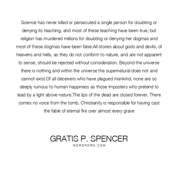 Science has never killed or persecuted a single person for doubting or denying its teaching, and most of these teaching have been true; but religion has murdered millions for doubting or denying her dogmas and most of these dogmas have been false.All stories about gods and devils, of heavens and hells, as they do not conform to nature, and are not apparent to sense, should be rejected without consideration. Beyond the universe there is nothing and within the universe the supernatural does not and cannot exist.Of all deceivers who have plagued mankind, none are so deeply ruinous to human happiness as those imposters who pretend to lead by a light above nature.The lips of the dead are closed forever. There comes no voice from the tomb. Christianity is responsible for having cast the fable of eternal fire over almost every grave