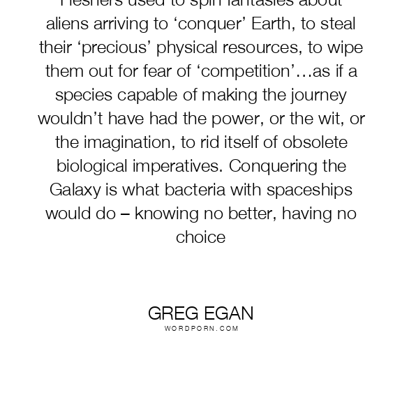 Fleshers used to spin fantasies about aliens arriving to ‘conquer’ Earth, to steal their ‘precious’ physical resources, to wipe them out for fear of ‘competition’…as if a species capable of making the journey wouldn’t have had the power, or the wit, or the imagination, to rid itself of obsolete biological imperatives. Conquering the Galaxy is what bacteria with spaceships would do – knowing no better, having no choice