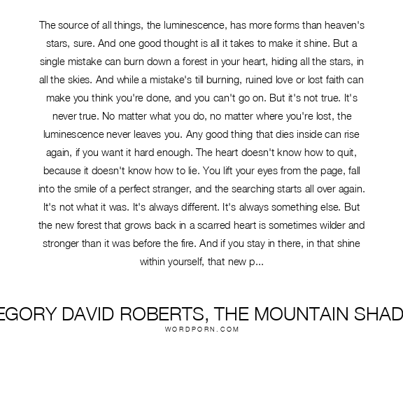 The source of all things, the luminescence, has more forms than heaven's stars, sure. And one good thought is all it takes to make it shine. But a single mistake can burn down a forest in your heart, hiding all the stars, in all the skies,. And while a mistake's till burning, ruined love or lsot faith can make you think you're done, and you can't go on. But it's not true. It's never true. No matter what you do, no matter where you're lost, the luminescence never leaves you. Any good thing that dies inside ca rise again, if you want it hard enough. The heart doesnt know how to quit, because it doesn't know how to lie. You lift your eyes from the page, fall into the smile of a perfect stranger, and the searching starts all over again. It's not what it was. It's always different. It's always something else. But the new forest that grows back in a scarred heart is sometimes wilder and stronger than it was before the fire. And if you stay in there, in that shine within yourself, that new place of light, forgiving everything and never giving up, sooner or later you'll always find yourself right back there where love and beauty made the world: at the beginning. The beginning. The beginning