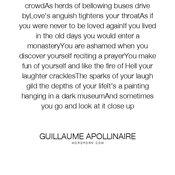 Now you are walking in Paris all alone in the crowdAs herds of bellowing buses drive byLove's anguish tightens your throatAs if you were never to be loved againIf you lived in the old days you would enter a monasteryYou are ashamed when you discover yourself reciting a prayerYou make fun of yourself and like the fire of Hell your laughter cracklesThe sparks of your laugh gild the depths of your lifeIt's a painting hanging in a dark museumAnd sometimes you go and look at it close up