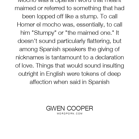 Mocho was a Spanish word that meant maimed or referred to something that had been lopped off like a stump. To call Homer el mocho was, essentially, to call him "Stumpy" or "the maimed one." It doesn't sound particularly flattering, but among Spanish speakers the giving of nicknames is tantamount to a declaration of love. Things that would sound insulting outright in English were tokens of deep affection when said in Spanish