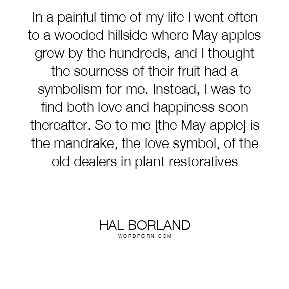 In a painful time of my life I went often to a wooded hillside where May apples grew by the hundreds, and I thought the sourness of their fruit had a symbolism for me. Instead, I was to find both love and happiness soon thereafter. So to me [the May apple] is the mandrake, the love symbol, of the old dealers in plant restoratives