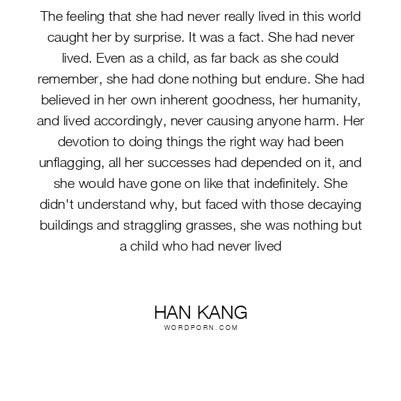 Only Yeong-hye, docile and naive, had been unable to deflect their father's temper or put up any form of resistance. Instead, she had merely absorbed all her suffering inside her, deep into the marrow of her bones. Now, with the benefit of hindsight, In-hye could see that the role that she had adopted back then of the hard-working, self-sacrificing eldest daughter had been a sign not of maturity but of cowardice. It had been a survival tactic