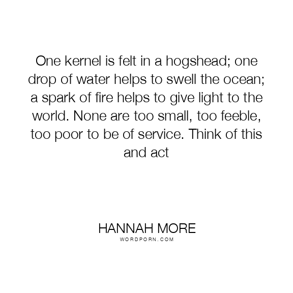 One kernel is felt in a hogshead; one drop of water helps to swell the ocean; a spark of fire helps to give light to the world. None are too small, too feeble, too poor to be of service. Think of this and act