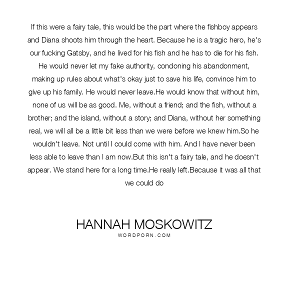 If this were a fairy tale, this would be the part where the fishboy appears and Diana shoots him through the heart. Because he is a tragic hero, he's our fucking Gatsby, and he lived for his fish and he has to die for his fish. He would never let my fake authority, condoning his abandonment, making up rules about what's okay just to save his life, convince him to give up his family. He would never leave.He would know that without him, none of us will be as good. Me, without a friend; and the fish, without a brother; and the island, without a story; and Diana, without her something real, we will all be a little bit less than we were before we knew him.So he wouldn't leave. Not until I could come with him. And I have never been less able to leave than I am now.But this isn't a fairy tale, and he doesn't appear. We stand here for a long time.He really left.Because it was all that we could do