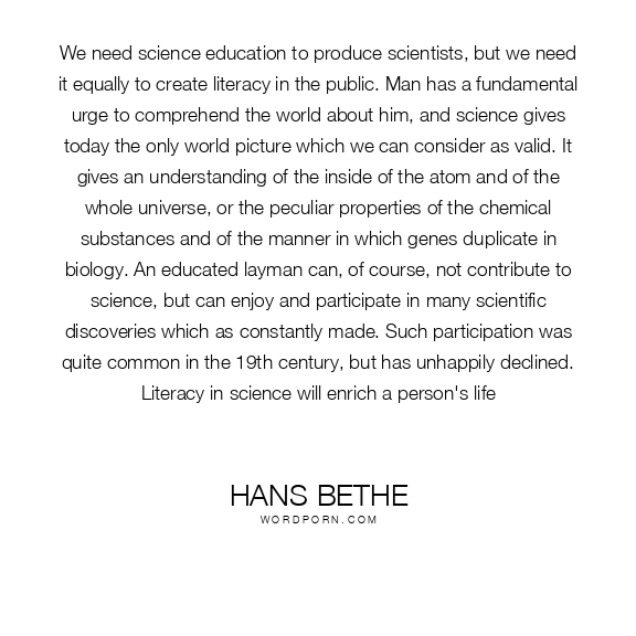 We need science education to produce scientists, but we need it equally to create literacy in the public. Man has a fundamental urge to comprehend the world about him, and science gives today the only world picture which we can consider as valid. It gives an understanding of the inside of the atom and of the whole universe, or the peculiar properties of the chemical substances and of the manner in which genes duplicate in biology. An educated layman can, of course, not contribute to science, but can enjoy and participate in many scientific discoveries which as constantly made. Such participation was quite common in the 19th century, but has unhappily declined. Literacy in science will enrich a person's life