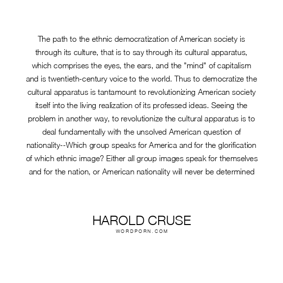 The path to the ethnic democratization of American society is through its culture, that is to say through its cultural apparatus, which comprises the eyes, the ears, and the "mind" of capitalism and is twentieth-century voice to the world. Thus to democratize the cultural apparatus is tantamount to revolutionizing American society itself into the living realization of its professed ideas. Seeing the problem in another way, to revolutionize the cultural apparatus is to deal fundamentally with the unsolved American question of nationality--Which group speaks for America and for the glorification of which ethnic image? Either all group images speak for themselves and for the nation, or American nationality will never be determined