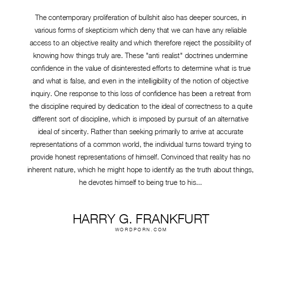 The contemporary proliferation of bullshit also has deeper sources, in various forms of skepticism which deny that we can have any reliable access to an objective reality and which therefore reject the possibility of knowing how things truly are. These "anti-realist" doctrines undermine confidence in the value of disinterested efforts to determine what is true and what is false, and even in the intelligibility of the notion of objective inquiry. One response to this loss of confidence has been a retreat from the discipline required by dedication to the ideal of correctness to a quite different sort of discipline, which is imposed by pursuit of an alternative ideal of sincerity. Rather than seeking primarily to arrive at accurate representations of a common world, the individual turns toward trying to provide honest representations of himself. Convinced that reality has no inherent nature, which he might hope to identify as the truth about things, he devotes himself to being true to his own nature. It is as though he decides that since it makes no sense to try to be true to the facts, he must therefore try instead to be true to himself.But it is preposterous to imagine that we ourselves are determinate, and hence susceptible both to correct and to incorrect descriptions, while supposing that the ascription of determinacy to anything else has been exposed as a mistake. As conscious beings, we exist only in response to other things, and we cannot know ourselves at all without knowing them. Moreover, there is nothing in theory, and certainly nothing in experience, to support the extraordinary judgment that it is the truth about himself that is the easiest for a person to know. Facts about ourselves are not peculiarly solid and resistant to skeptical dissolution. Our natures are, indeed, elusively insubstantial -- notoriously less stable and less inherent than the natures of other things. And insofar as this is the case, sincerity itself is bullshit