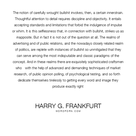 The notion of carefully wrought bullshit involves, then, a certain innerstrain. Thoughtful attention to detail requires discipline and objectivity. It entails accepting standards and limitations that forbid the indulgence of impulse or whim. It is this selflessness that, in connection with bullshit, strikes us as inapposite. But in fact it is not out of the question at all. The realms of advertising and of public relations, and the nowadays closely related realm of politics, are replete with instances of bullshit so unmitigated that they can serve among the most indisputable and classic paradigms of the concept. And in these realms there are exquisitely sophisticated craftsmen who - with the help of advanced and demanding techniques of market research, of public opinion polling, of psychological testing, and so forth - dedicate themselves tirelessly to getting every word and image they produce exactly right