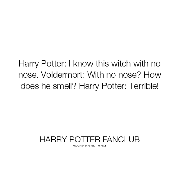 Copy Image Harry Potter: I know this witch with no nose. Voldermort: With no nose? How does he smell? Harry Potter: Terrible! Moms Typewriter A A SAVE THIS IMAGE