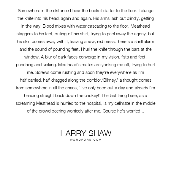 Somewhere in the distance I hear the bucket clatter to the floor. I plunge the knife into his head, again and again. His arms lash out blindly, getting in the way. Blood mixes with water cascading to the floor. Meathead staggers to his feet, pulling off his shirt, trying to peel away the agony, but his skin comes away with it, leaving a raw, red mess.There’s a shrill alarm and the sound of pounding feet. I hurl the knife through the bars at the window. A blur of dark faces converge in my vision, fists and feet, punching and kicking. Meathead’s mates are yanking me off, trying to hurt me. Screws come rushing and soon they’re everywhere as I’m half-carried, half-dragged along the corridor.‘Blimey,’ a thought comes from somewhere in all the chaos, ‘I’ve only been out a day and already I’m heading straight back down the chokey!’ The last thing I see, as a screaming Meathead is hurried to the hospital, is my cellmate in the middle of the crowd peering worriedly after me. Course he’s worried! The stinky bastard is wondering where his next bit of scag is coming from!