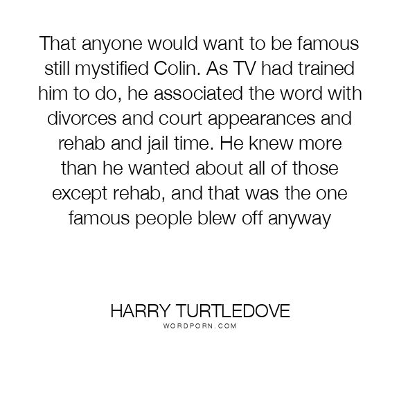 That anyone would want to be famous still mystified Colin. As TV had trained him to do, he associated the word with divorces and court appearances and rehab and jail time. He knew more than he wanted about all of those except rehab, and that was the one famous people blew off anyway