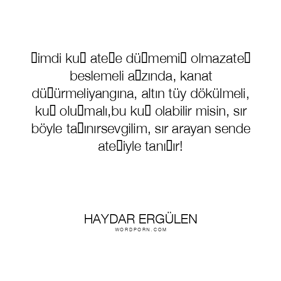 şimdi kuş ateşe düşmemiş olmazateş beslemeli ağzında, kanat düşürmeliyangına, altın tüy dökülmeli, kuş oluşmalı,bu kuş olabilir misin, sır böyle taşınırsevgilim, sır arayan sende ateşiyle tanışır!