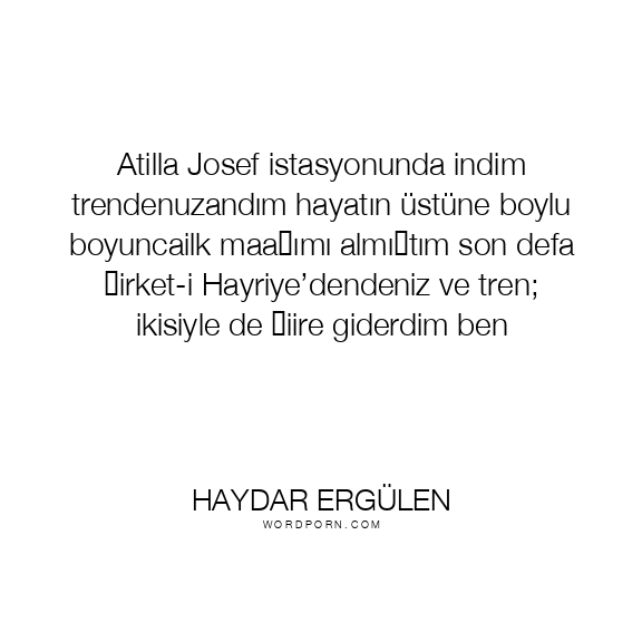 Atilla Josef istasyonunda indim trendenuzandım hayatın üstüne boylu boyuncailk maaşımı almıştım son defa Şirket-i Hayriye’dendeniz ve tren; ikisiyle de şiire giderdim ben