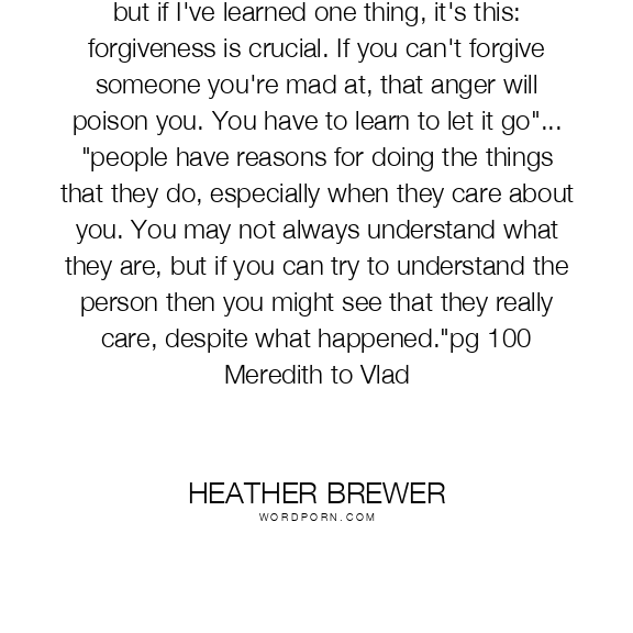 but if I've learned one thing, it's this: forgiveness is crucial. If you can't forgive someone you're mad at, that anger will poison you. You have to learn to let it go"... "people have reasons for doing the things that they do, especially when they care about you. You may not always understand what they are, but if you can try to understand the person then you might see that they really care, despite what happened."pg 100 Meredith to Vlad