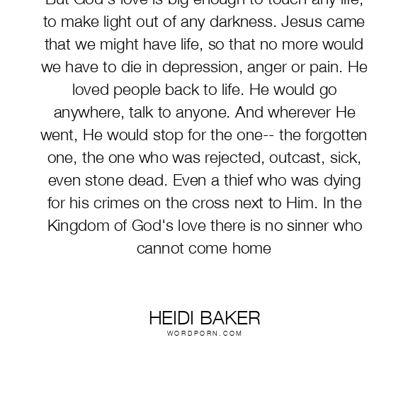 But God's love is big enough to touch any life, to make light out of any darkness. Jesus came that we might have life, so that no more would we have to die in depression, anger or pain. He loved people back to life. He would go anywhere, talk to anyone. And wherever He went, He would stop for the one-- the forgotten one, the one who was rejected, outcast, sick, even stone dead. Even a thief who was dying for his crimes on the cross next to Him. In the Kingdom of God's love there is no sinner who cannot come home