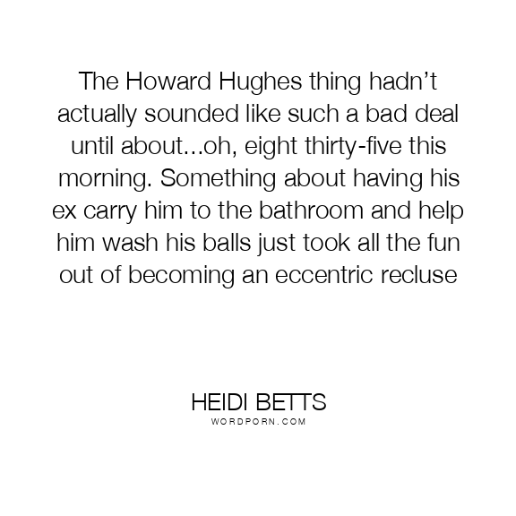 The Howard Hughes thing hadn’t actually sounded like such a bad deal until about...oh, eight thirty-five this morning. Something about having his ex carry him to the bathroom and help him wash his balls just took all the fun out of becoming an eccentric recluse