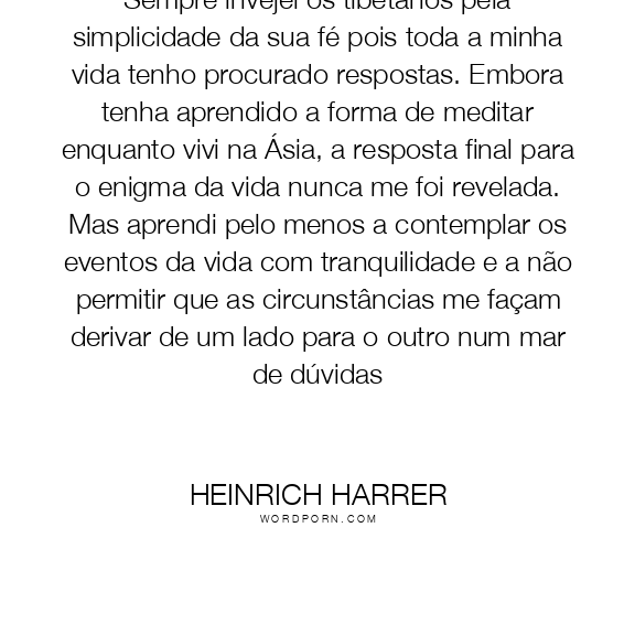 Sempre invejei os tibetanos pela simplicidade da sua fé pois toda a minha vida tenho procurado respostas. Embora tenha aprendido a forma de meditar enquanto vivi na Ásia, a resposta final para o enigma da vida nunca me foi revelada. Mas aprendi pelo menos a contemplar os eventos da vida com tranquilidade e a não permitir que as circunstâncias me façam derivar de um lado para o outro num mar de dúvidas