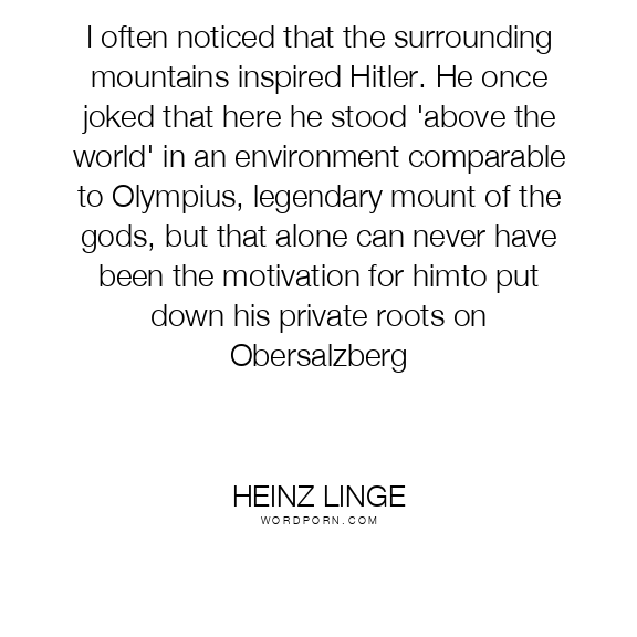 I often noticed that the surrounding mountains inspired Hitler. He once joked that here he stood 'above the world' in an environment comparable to Olympius, legendary mount of the gods, but that alone can never have been the motivation for himto put down his private roots on Obersalzberg