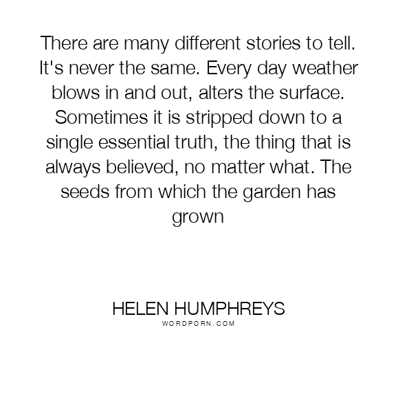 There are many different stories to tell. It's never the same. Every day weather blows in and out, alters the surface. Sometimes it is stripped down to a single essential truth, the thing that is always believed, no matter what. The seeds from which the garden has grown