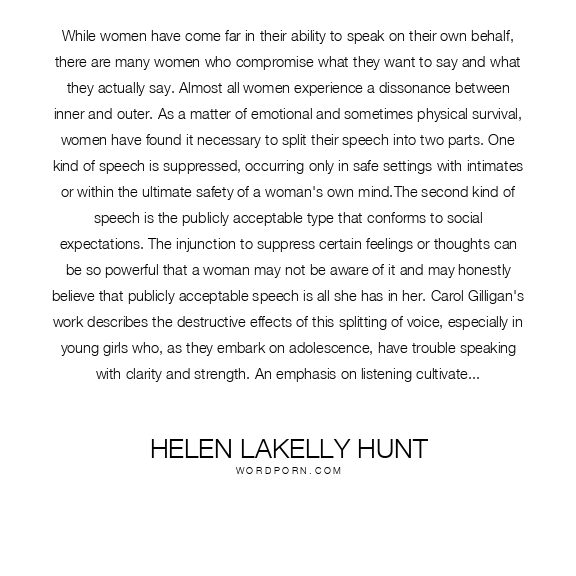 While women have come far in their ability to speak on their own behalf, there are many women who compromise what they want to say and what they actually say. Almost all women experience a dissonance between inner and outer. As a matter of emotional and sometimes physical survival, women have found it necessary to split their speech into two parts. One kind of speech is suppressed, occurring only in safe settings with intimates or within the ultimate safety of a woman's own mind.The second kind of speech is the publicly acceptable type that conforms to social expectations. The injunction to suppress certain feelings or thoughts can be so powerful that a woman may not be aware of it and may honestly believe that publicly acceptable speech is all she has in her. Carol Gilligan's work describes the destructive effects of this splitting of voice, especially in young girls who, as they embark on adolescence, have trouble speaking with clarity and strength. An emphasis on listening cultivates a stronger expression of voice. Listening is a crucial component in Imago Theory, where couples are taught to mirror, or repeat back, each other's thoughts, feelings, and needs as a way of building not only their partner's sense of self, but their own. Our core self becomes stronger when it is mirrored back. Voice that is not mirrored dies. When the process of mirroring is followed by validating and empathizing, a deep listening is done with feeling. All of us need validation -- that who we are, what we think, and how we feel does make sense. And the deepest form of listening is empathy, by which we are able to resonate on a soul level with the feelings and needs of one another.A wise proverb states that "Speech is silver, Silence is gold," reminding us of the forgotten value of silence. Feminist theorist Patrocinio Schweickart chose those words as the title of her article on talking and listening that parallels the inward and outward rhythm of Imago dialogue. She points our attention to the value of quiet as a tool that helps us notice the complex interplay of inner and outer that characterizes any creative process. For something new to happen, we need silence and receptivity as well as action and productivity. While some theorists see speaking as active and listening as passive, Schweickart and Imago Theory both point to the reality that both speaking and listening are active. Listening is a way of meaning-making. Theologian Nelle Morten refers to this dynamic as "hearing each other into speech."Ultimately, the development of authentic voice is a process that involves that involves a flow between speaking and listening. In listening, one becomes attuned to the surroundings so that speech becomes relevant and meaningful. This undulating rhythm of speaking and listening is the bedrock for dialogue in Imago Theory and for all of us who care about relationship