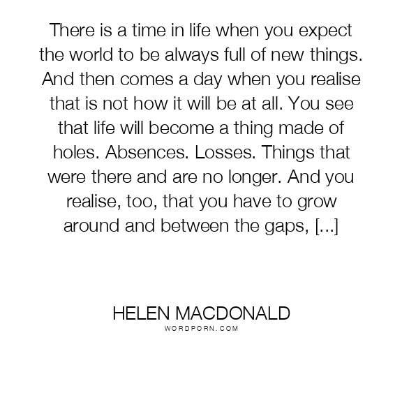 There is a time in life when you expect the world to be always full of new things. And then comes a day when you realise that is not how it will be at all. You see that life will become a thing made of holes. Absences. Losses. Things that were there and are no longer. And you realise, too, that you have to grow around and between the gaps, [...]