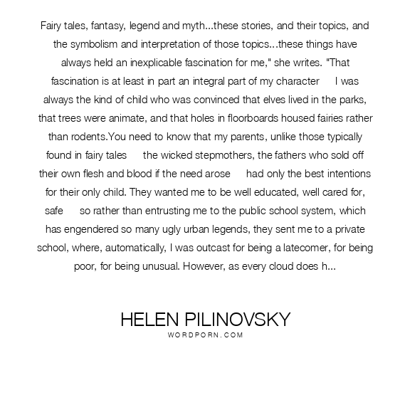Fairy tales, fantasy, legend and myth...these stories, and their topics, and the symbolism and interpretation of those topics...these things have always held an inexplicable fascination for me," she writes. "That fascination is at least in part an integral part of my character — I was always the kind of child who was convinced that elves lived in the parks, that trees were animate, and that holes in floorboards housed fairies rather than rodents.You need to know that my parents, unlike those typically found in fairy tales — the wicked stepmothers, the fathers who sold off their own flesh and blood if the need arose — had only the best intentions for their only child. They wanted me to be well educated, well cared for, safe — so rather than entrusting me to the public school system, which has engendered so many ugly urban legends, they sent me to a private school, where, automatically, I was outcast for being a latecomer, for being poor, for being unusual. However, as every cloud does have a silver lining — and every miserable private institution an excellent library — there was some solace to be found, between the carved oak cases, surrounded by the well–lined shelves, among the pages of the heavy antique tomes, within the realms of fantasy.Libraries and bookshops, and indulgent parents, and myriad books housed in a plethora of nooks to hide in when I should have been attending math classes...or cleaning my room...or doing homework...provided me with an alternative to a reality I didn't much like. Ten years ago, you could have seen a number of things in the literary field that just don't seem to exist anymore: valuable antique volumes routinely available on library shelves; privately run bookshops, rather than faceless chains; and one particular little girl who haunted both the latter two institutions. In either, you could have seen some variation upon a scene played out so often that it almost became an archetype:A little girl, contorted, with her legs twisted beneath her, shoulders hunched to bring her long nose closer to the pages that she peruses. Her eyes are glued to the pages, rapt with interest. Within them, she finds the kingdoms of Myth. Their borders stand unguarded, and any who would venture past them are free to stay and occupy themselves as they would