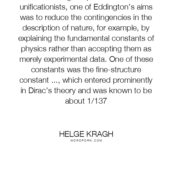 Following the path of earlier unificationists, one of Eddington's aims was to reduce the contingencies in the description of nature, for example, by explaining the fundamental constants of physics rather than accepting them as merely experimental data. One of these constants was the fine-structure constant ..., which entered prominently in Dirac's theory and was known to be about 1/137