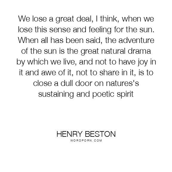 We lose a great deal, I think, when we lose this sense and feeling for the sun. When all has been said, the adventure of the sun is the great natural drama by which we live, and not to have joy in it and awe of it, not to share in it, is to close a dull door on natures's sustaining and poetic spirit