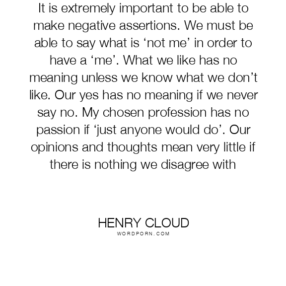 It is extremely important to be able to make negative assertions. We must be able to say what is ‘not me’ in order to have a ‘me’. What we like has no meaning unless we know what we don’t like. Our yes has no meaning if we never say no. My chosen profession has no passion if ‘just anyone would do’. Our opinions and thoughts mean very little if there is nothing we disagree with