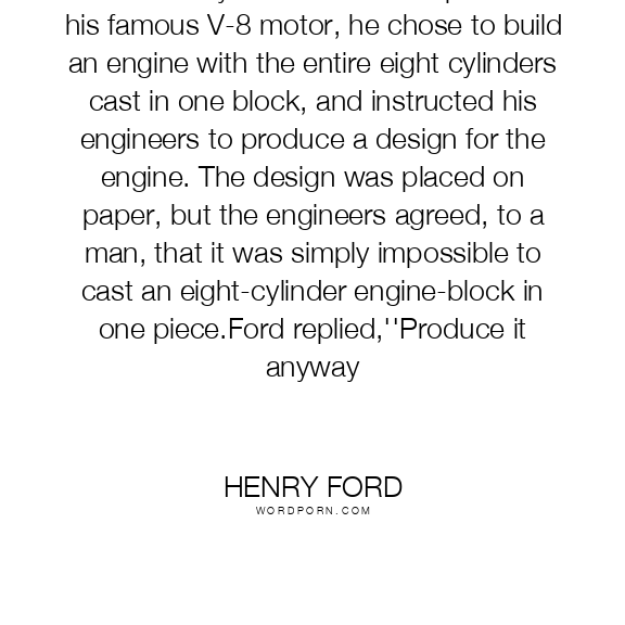 When Henry Ford decided to produce his famous V-8 motor, he chose to build an engine with the entire eight cylinders cast in one block, and instructed his engineers to produce a design for the engine. The design was placed on paper, but the engineers agreed, to a man, that it was simply impossible to cast an eight-cylinder engine-block in one piece.Ford replied,''Produce it anyway