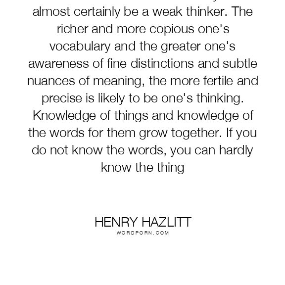 A man with a scant vocabulary will almost certainly be a weak thinker. The richer and more copious one's vocabulary and the greater one's awareness of fine distinctions and subtle nuances of meaning, the more fertile and precise is likely to be one's thinking. Knowledge of things and knowledge of the words for them grow together. If you do not know the words, you can hardly know the thing