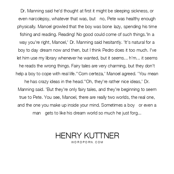 Dr. Manning said he'd thought at first it might be sleeping sickness, or even narcolepsy, whatever that was, but - no, Pete was healthy enough physically. Manoel growled that the boy was bone-lazy, spending his time fishing and reading. Reading! No good could come of such things.'In a way you're right, Manoel,' Dr. Manning said hesitantly. 'It's natural for a boy to day-dream now and then, but I think Pedro does it too much. I've let him use my library whenever he wanted, but it seems... h'm... it seems he reads the wrong things. Fairy tales are very charming, but they don't help a boy to cope with real life.''Com certeza,' Manoel agreed. 'You mean he has crazy ideas in the head.''Oh, they're rather nice ideas,' Dr. Manning said. 'But they're only fairy tales, and they're beginning to seem true to Pete. You see, Manoel, there are really two worlds, the real one, and the one you make up inside your mind. Sometimes a boy - or even a man - gets to like his dream world so much he just forgets about the real one and lives in the one he's made up.''I know,' Manoel said. 'I have seen some who do that. It is a bad thing.''It would be bad for Pete. He's a very sensitive boy. If you live too much in dreams, you can't face real life squarely.'("Before I Wake...")
